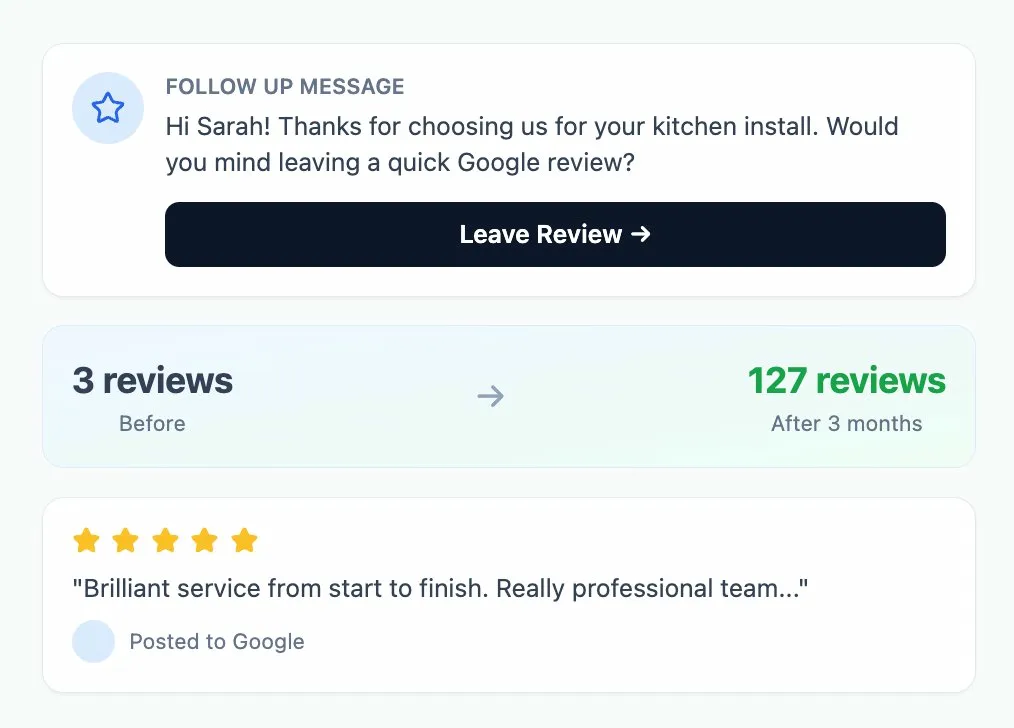 Send high converting review requests direct to your customers after every job. No more confusion, awkward asking or lost revenue.